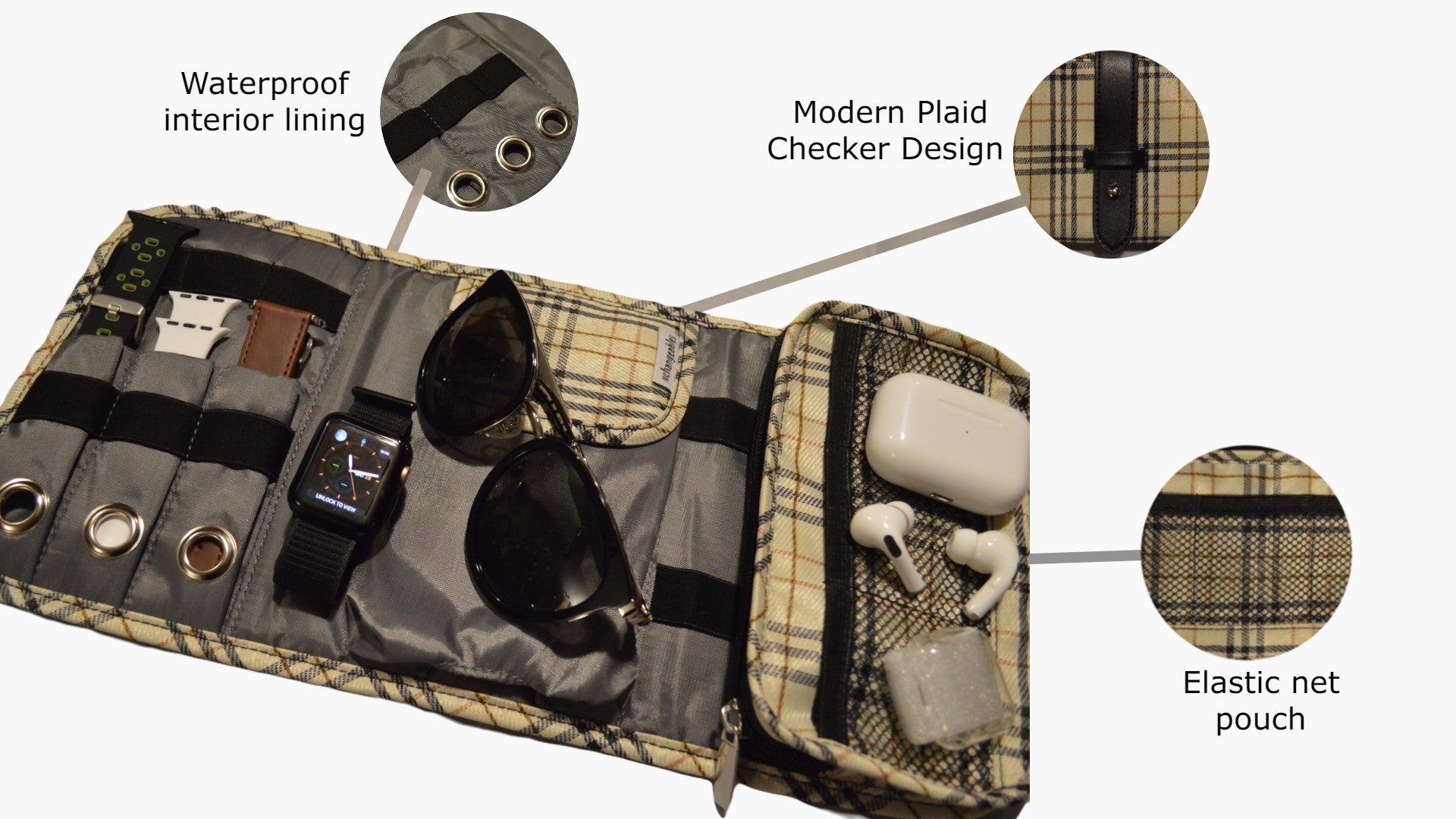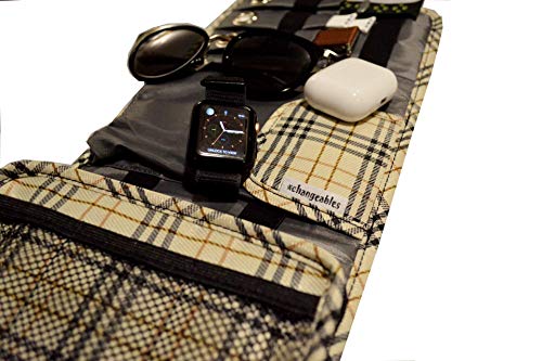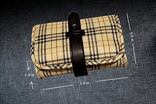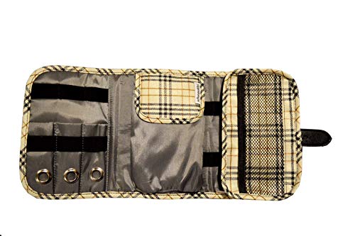 - SOLID CONSTRUCTION: Designed for everyday use. High-quality plaid fabric outer material, interior nylon pockets, elastics to hold watch straps, flap velcro-closure compartment for larger accessories, zippered compartment for secure storage, net elastic pockets fitted for iPods, Airpods, case cover & memory cards.