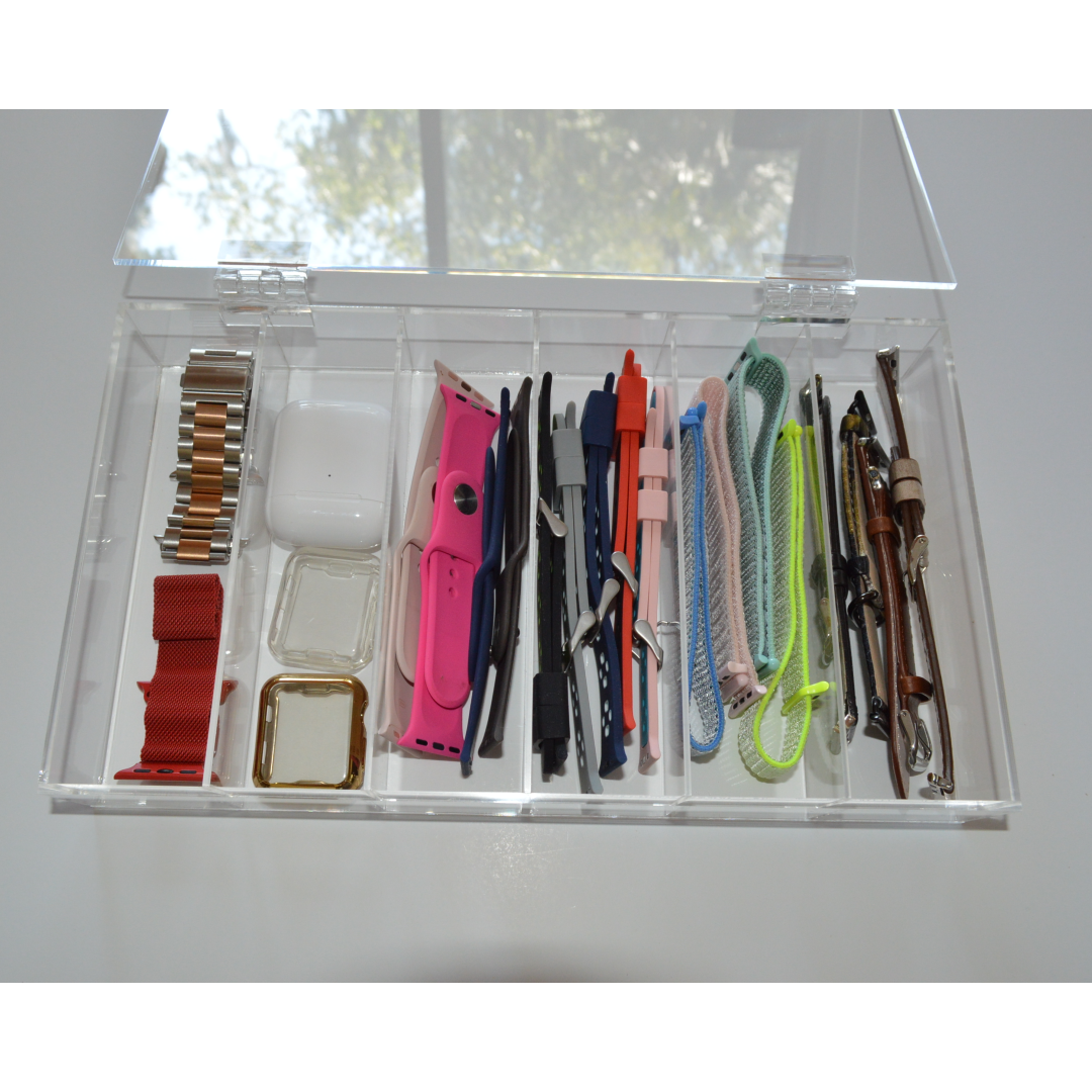 Description: Clear storage and organizer box for your Apple watch bands. Protect and display your favorite smartwatch straps collection in one compact case. Store collections of sunglasses, watches & jewelries in this high-quality acrylic organizer, rust-proof hinges & easy open-close cover. Store up to 40+ straps. A perfect gift for all occasions including birthday, anniversary, Christmas Holiday, retirement gift for every Apple watch owner and Sunglass collectors! Dimensions: 11 x 6.5 x 1.75 inches Weight: 1.10 lbs NOTE: watch, bands/straps, organizer surface liners & accessories are for display purposes and are not included in the sale.