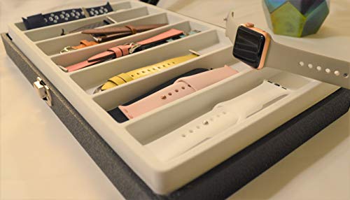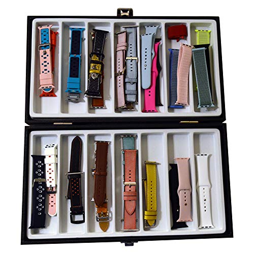 Details: Organizer and storage box for your Apple watch bands and accessories. Easily store, view and display your favorite Apple watch series 1, 2, 3, & 4 bands collection in one compact storage organizer. This storage case is made of wood in leatherette casing, tempered glass cover, and metal latch clasp closure. Store multiple bands conveniently in the 7-compartment velvety tray, can fit 38mm, 40mm & 42mm watch bands. A perfect birthday, anniversary, Christmas holiday, retirement gift for every Apple watch owners and enthusiasts!